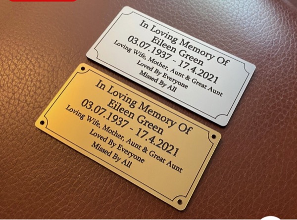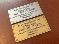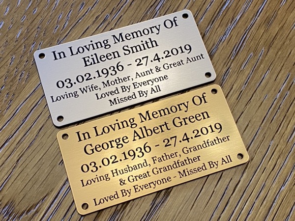 Engraved memorial plaques, urn plaques and bench plaques. All manufactured from a modern Traffolyte equivalent material which is a 2 ply high impact acrylic material.